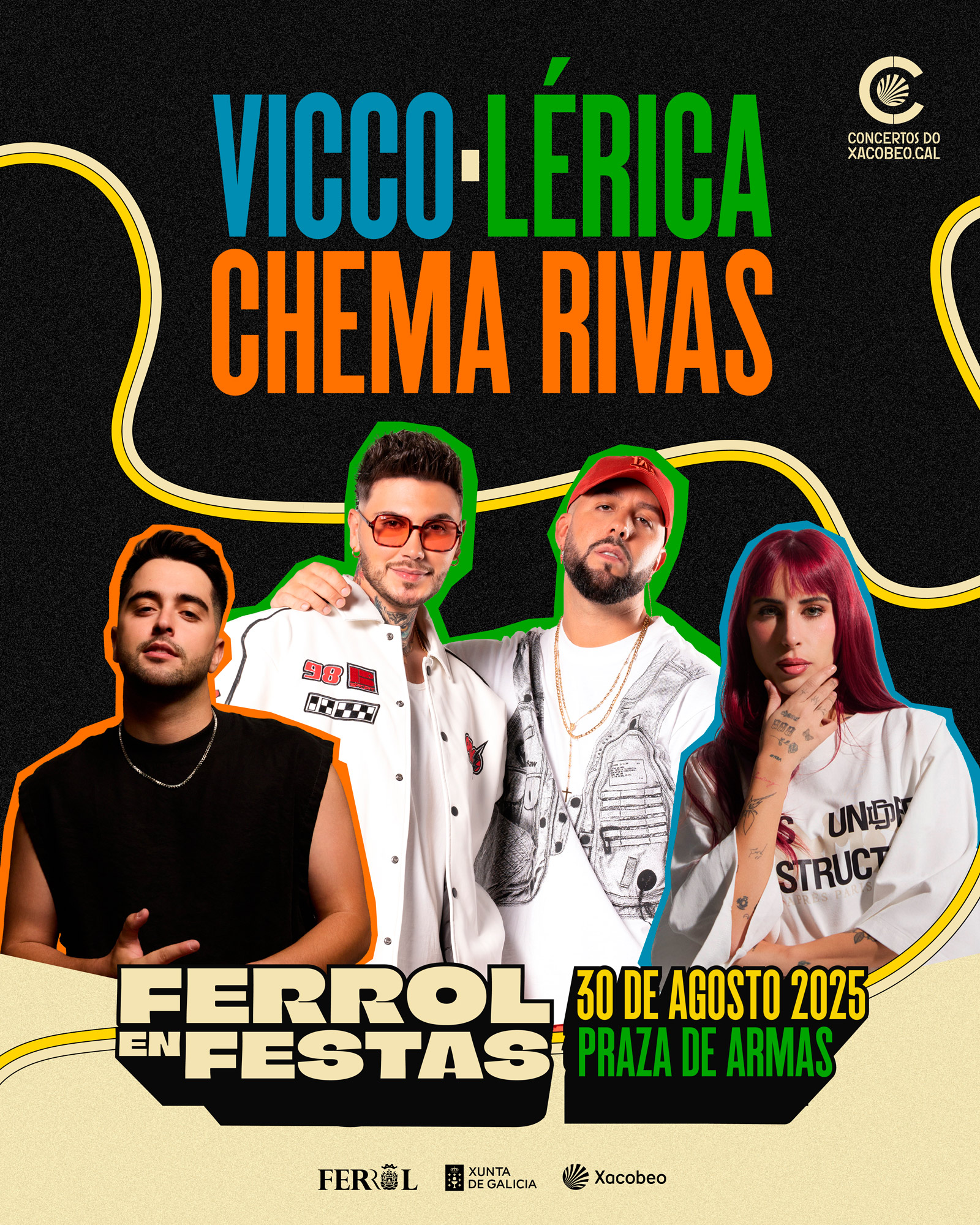 Neste 2025, os Concertos do Xacobeo da Xunta de Galicia apoian a celebración das Festas de Ferrol do 22 ao 31 de agosto, dándolle as súas destacadas citas musicais. Así, a mellor música urbana actual encherá a Praza de Armas da localidade ferrolá da man de demandadas figuras que suman miles de escoitas nas plataformas dixitais, como Vicco, Lérica e Chema Rivas.