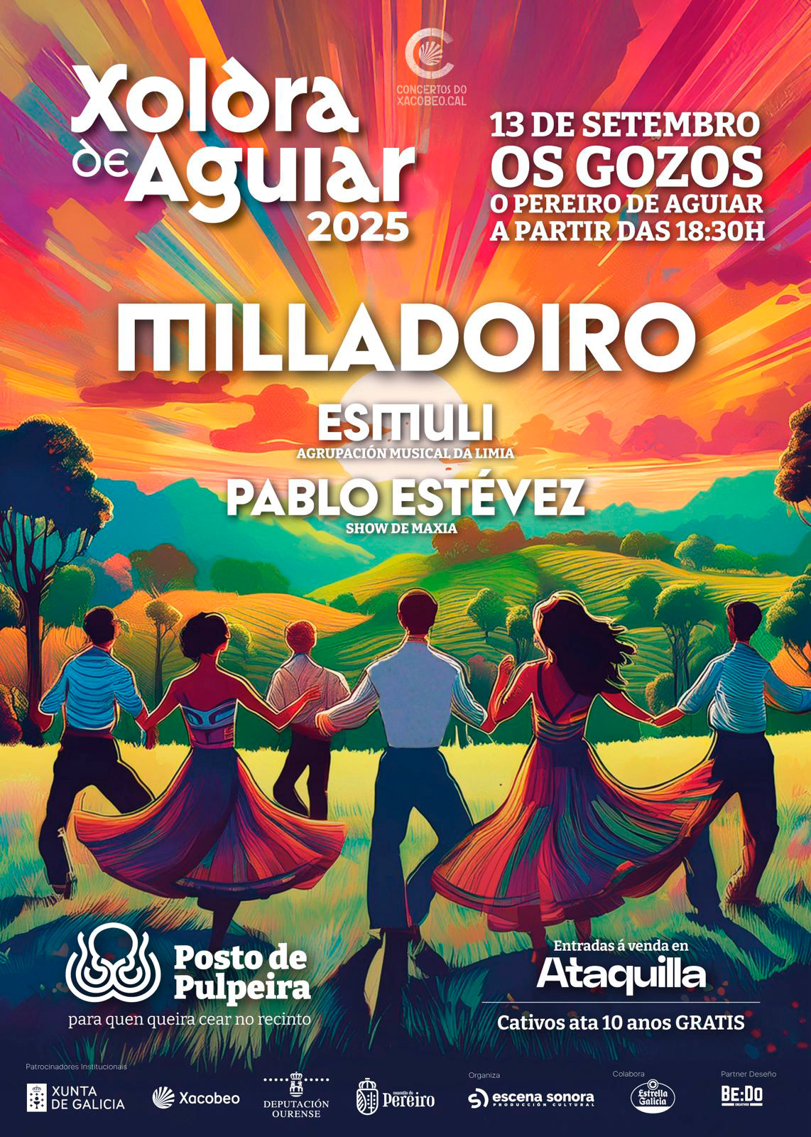 Este ano, Xoldra de Aguiar regresa a Os Gozos, no Concello do Pereiro de Aguiar, e, como non podía ser doutro xeito, na hora da comida haberá unha pulpeira con diferentes opcións para todos os gustos. A música estará a cargo dunha banda tan mítica da nosa escena como Milladoiro.