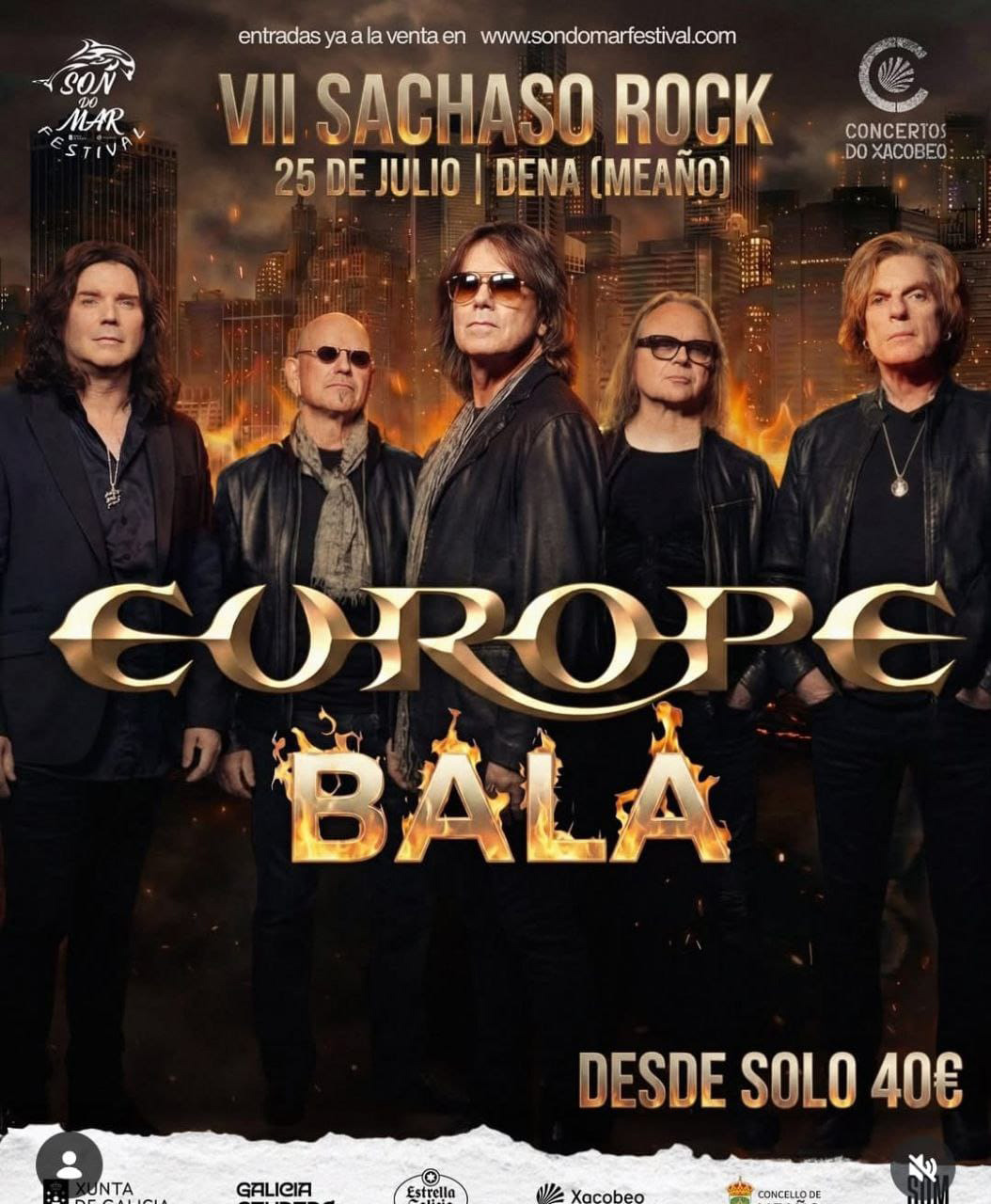 O 25 de xullo terá lugar o Sachaso Rock co apoio dos Concertos do Xacobeo. A mítica banda de rock Europe encabezará a sétima edición do festival, que este ano muda a localización e pasa a celebrarse no Concello de Meaño. Éxitos como ‘The Final Countdown’, ‘Carrie’, ‘Rock To Night’, ‘Cherokee’ ou ‘Superstitious’ soarán nun concerto que non deixará a ninguén indiferente.